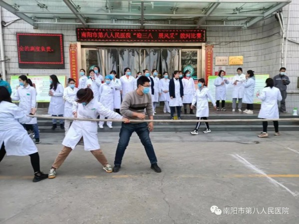 为庆祝即将到来的“三八”国际妇女节,全面贯彻落实“新时代文明实践推动周”活动,丰富医院职工的文化生活,3月7日下午,南阳市第八人民医院工会举办拔河比赛,全院女职工和部分男同胞参与其中。