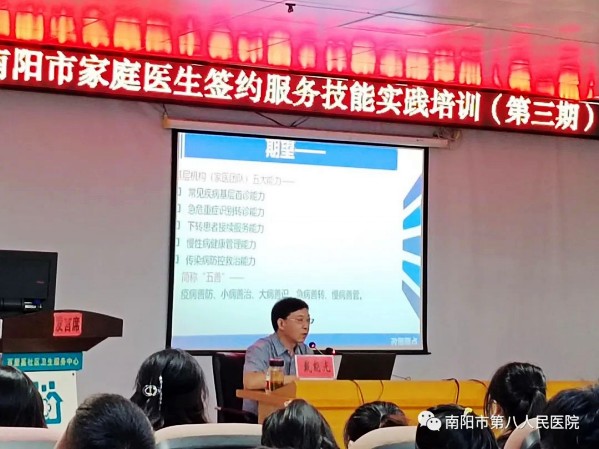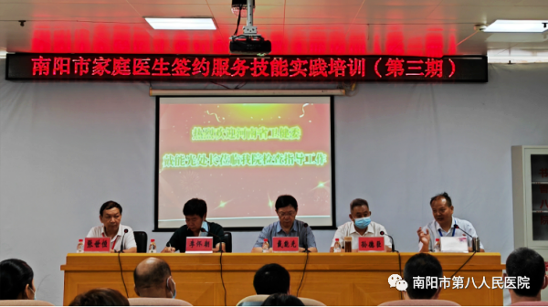 王进宝院长代表我院全体干部职工欢迎戴处长、孙德臣主任、李怀朝科长莅临我院检查指导工作。自7月11日南阳市家庭医生签约服务技能实践培训(第一期)开班以来,现已进行至第三期培训阶段,近来天气炎热,正值夏季高温季节,各县市区前来参加培训的学员不畏酷暑、牢记使命担当,深入社区、村庄开展家庭医生签约实践工作,戴处长的到来为大家带来了暖心的问候、夏日的清凉。