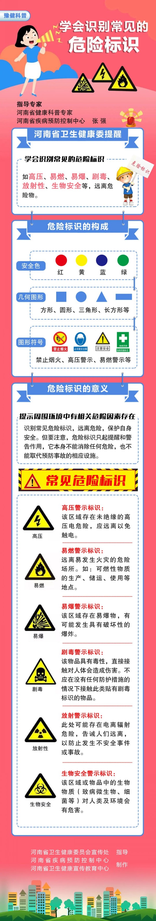 中国公民健康素养66条——第57条:会识别常见的危险标识,如高压、易燃、易爆、剧毒、放射性、生物安全等,远离危险物。危险标识由安全色,几何图形和图形符号构成,用以表达特定的危险信息,提示人们周围环境中有相关危险因素存在。