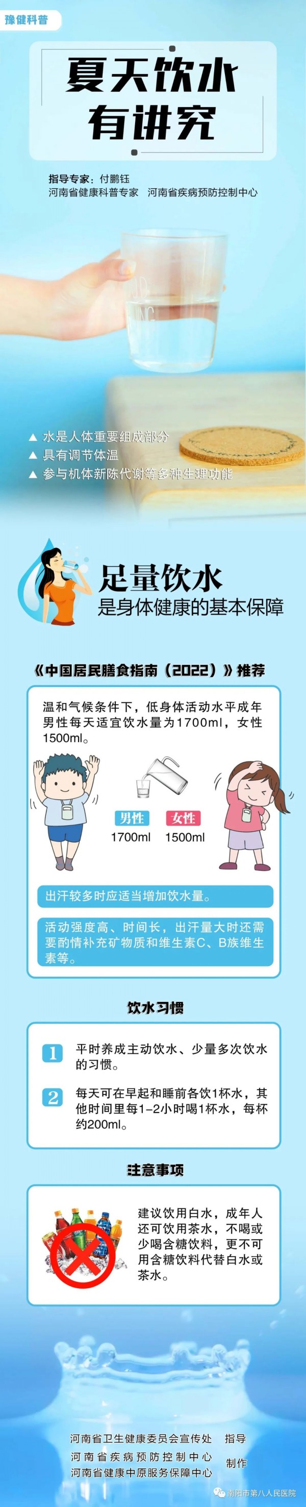 夏季天气炎热,气温升高,若出汗较多时应适当增加饮水量。身体活动强度高、时间长,出汗量大时更要及时补充水分,并酌情补充矿物质和维生素C、B族维生素等。